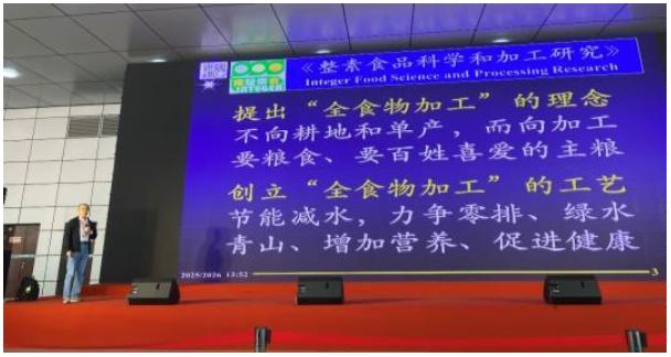 在展会同期举办的论坛上,吴奇院士做了题为《从全豆豆腐到全新素肉》的主旨报告,向行业精英分享了中心在食品加工领域的系统性研究成果,从传统豆制品的工艺革新、到以大豆豆粕为主要原料的素肉研发,以及以鲜薯为原料的土豆米产业化,以科技赋能产业升级,成为展会焦点。吴院士将“食品加工”与“端牢中国饭碗”、“国民健康产业”相关联,提出“全食物加工”的理念,即将农作物原料完整无损地加工为兼具口感、营养和性价比(好吃、营养、还便宜)的新型主粮与食品,走出“不向耕地要亩产,而向创新加工要粮食、要主粮和营养”的新质生产力发展新路径。